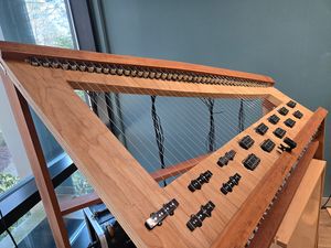 Aaron explains the programming behind the music. He selected thirteen music styles as guides for the compositions. Some are styles that Aaron originated. Others are loosely based on styles such as Indian music, selected composers, and fusions such as “what it might sound like if Beethoven wrote marimba works”. The program operates via a mini-PC. Notes sound as solenoid cells strike piano wires strung through a frame. The music comes through six speakers which Aaron built, creating a surround sound effect.