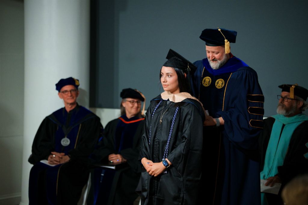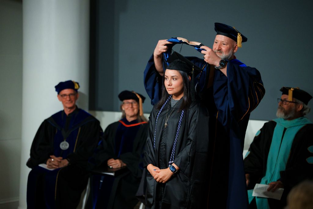 The 2025 Master's Hooding ceremony was held on Friday, May 9, 2025. In this service, Graduate Program graduates wear caps and gowns and receive their master’s hood from faculty.